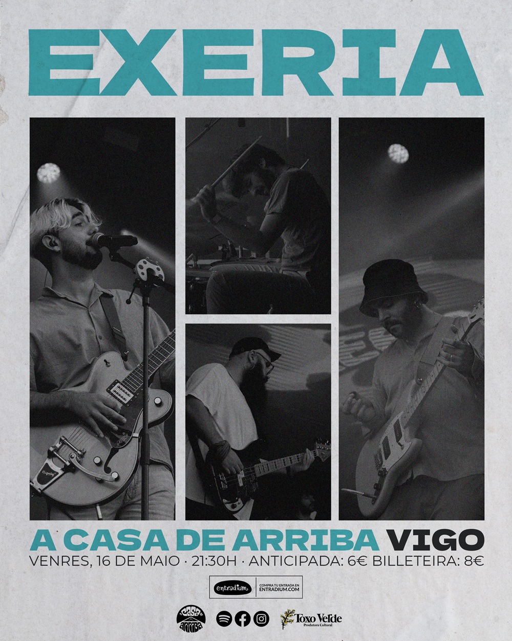 O vindeiro venres 16 a banda Exeria presentarase en formato acústico, no que transmutarán varios temas, cambiando o seu xénero musical e xogando coas cancións. Unha oportunidade única de velos nunha contorna íntima e a distancias curtas.