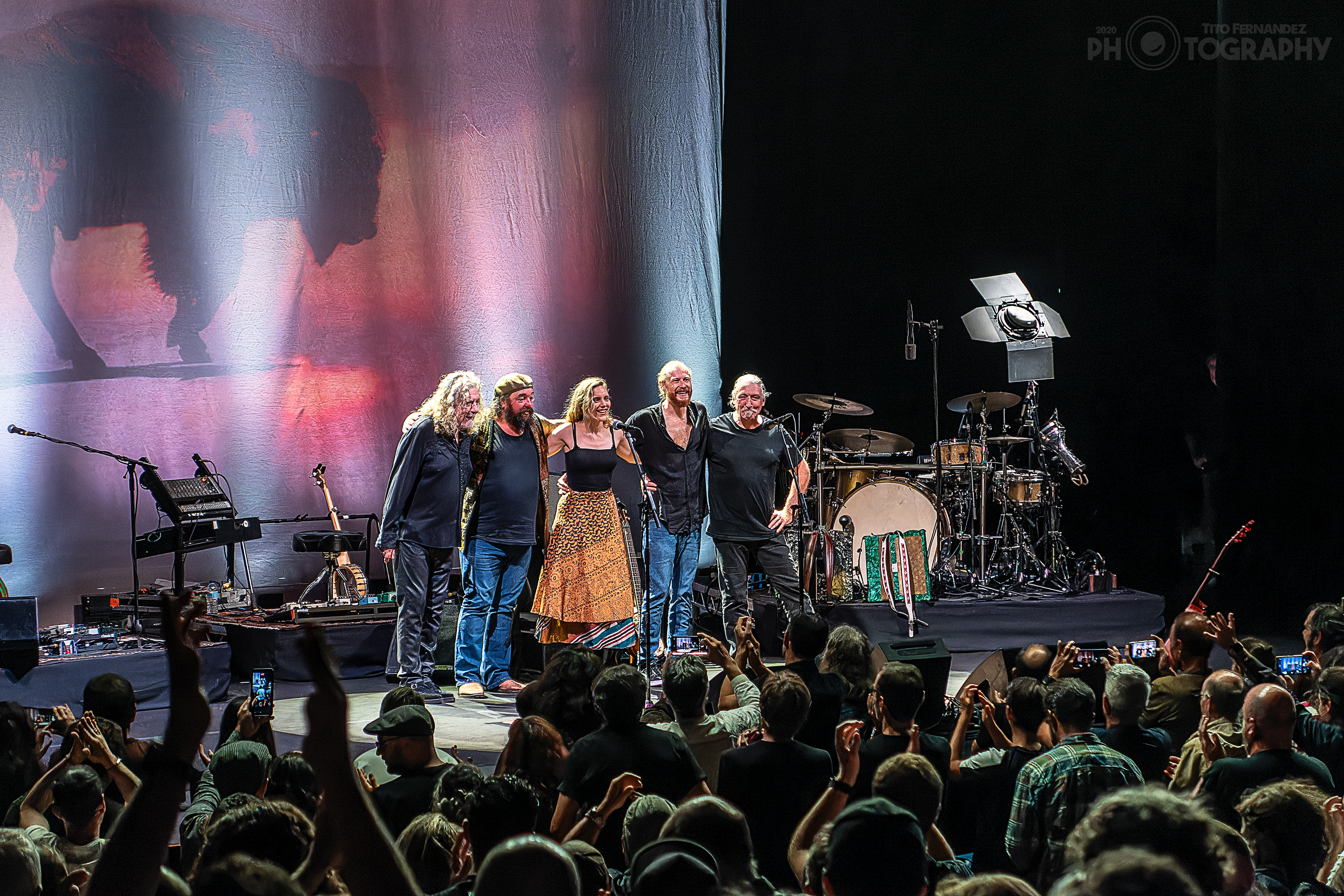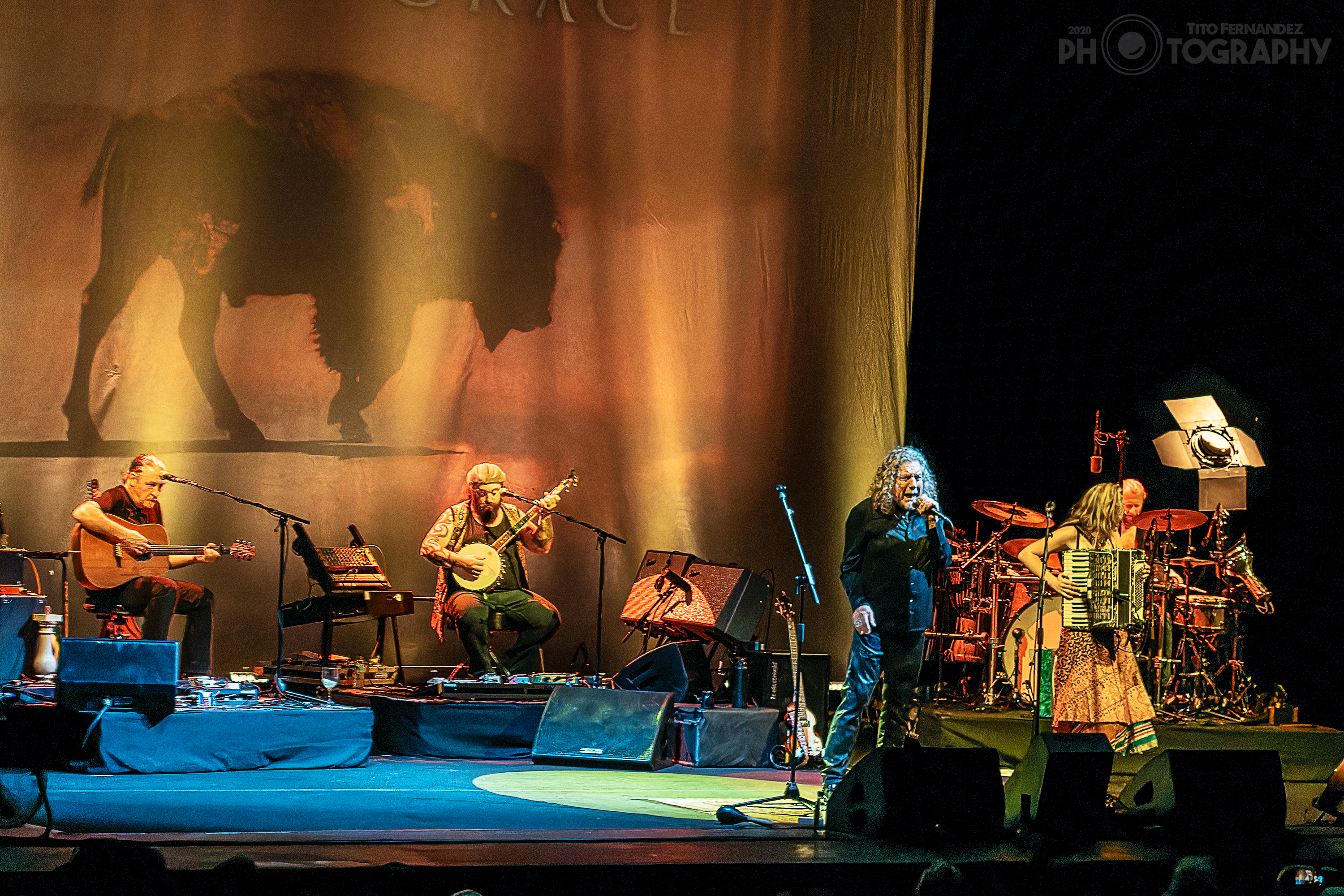 Salieron al escenario en primer lugar las cuerdas y la percusión para arrancar el evento bajo los acordes del espiritual clásico “Gospel plow”, reminiscencias religiosas a modo de preámbulo litúrgico para la ceremonia recién iniciada, incorporándose el dúo de voces Robert Plant y Suzi Dian con una sonora ovación de por medio. A continuación un clásico del folk americano: “The cuckoo” interpretado por los dos vocalistas. Tema original del músico de los Apalaches Clarence Asley que a nosotros se nos hace más próximo por la versión que del tema hizo el irlandés Rory Gallagher. Seguiría “Let the four winds blow” composición del propio Plant perteneciente al disco: “Mighty ReArranger” interpretado por él y con Suzi (bajo eléctrico) y el resto de las banda en perfecta armonía vocal. Cierre de la primera tandada de la noche con la zeppeliana “Friends” (Led Zeppelin III). Primero de los cuatro temas de la Banda con que se nos regaló durante la velada. Ovación y personal en pie.