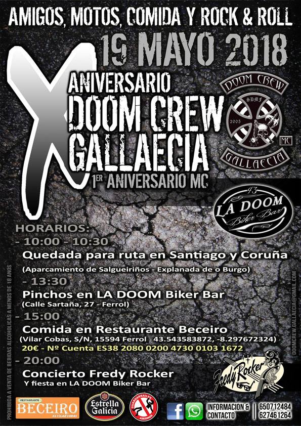 Doom Crew MC Gallaecia celebra su Xª Fiesta Motera en Ferrol el 19 de mayo. El evento se desarrollará según el siguiente programa: