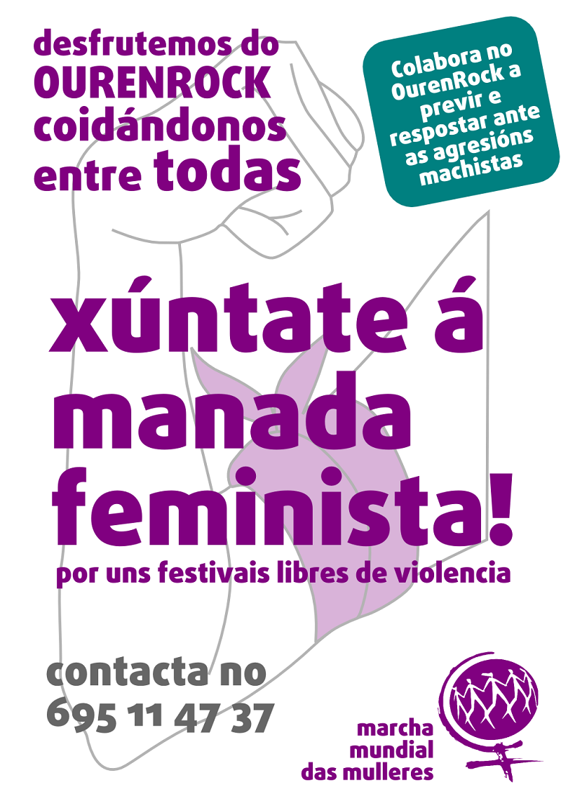 Marcha Mundial Mulleres Galiza en el cual habrás información, y por el recinto vereis a mujeres con un brazalete lila controlando, y si fuese el caso respondiendo acompañadas de mienbros del equipo