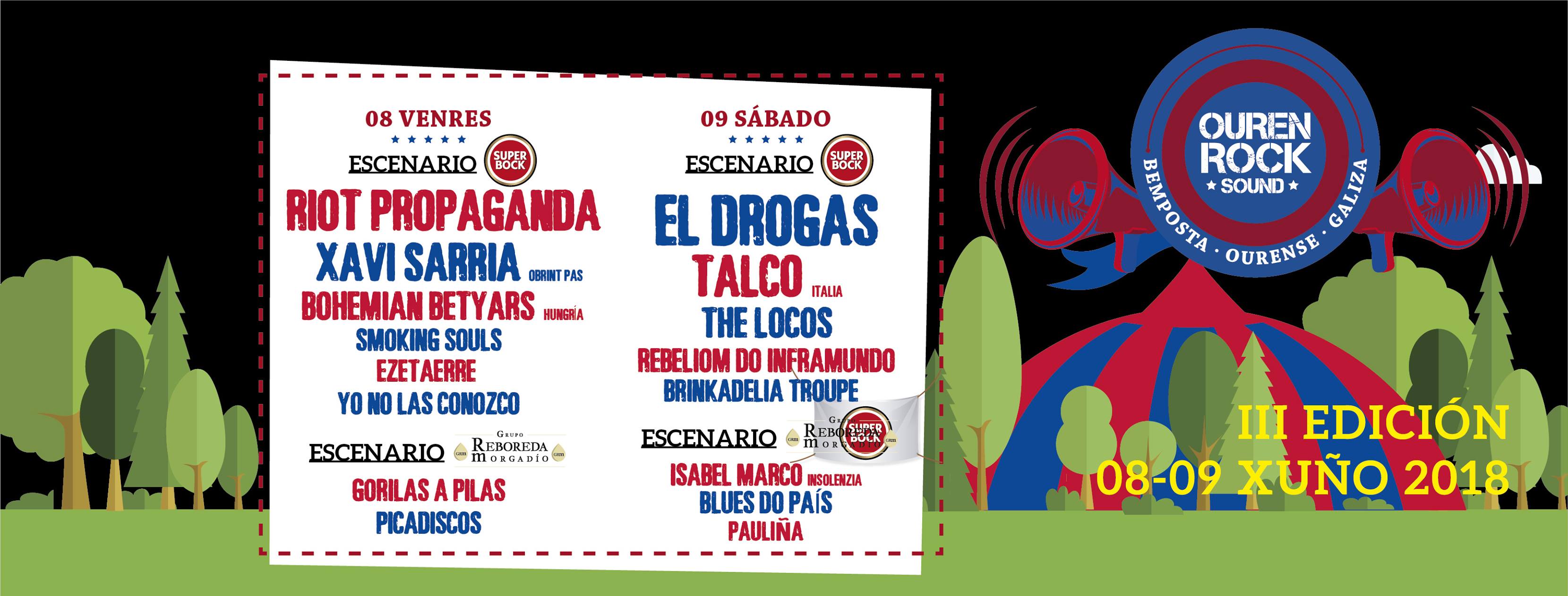 No queda nada, el OurenRock Sound Festival está a la vuelta de la esquina. Los próximos 08 y 09 de junio en Benposta (Ourense) se celebrará la tercera edición del Festival que este año cuenta con Riot Propaganda y El Drogas como cabezas de cartel además de The Locos, Talco, Xavi Sarrià, Ezetaerre, Rebeliom do Inframundo... hasta un total de 16 artistas de los que podrás disfrutar este fin de semana.