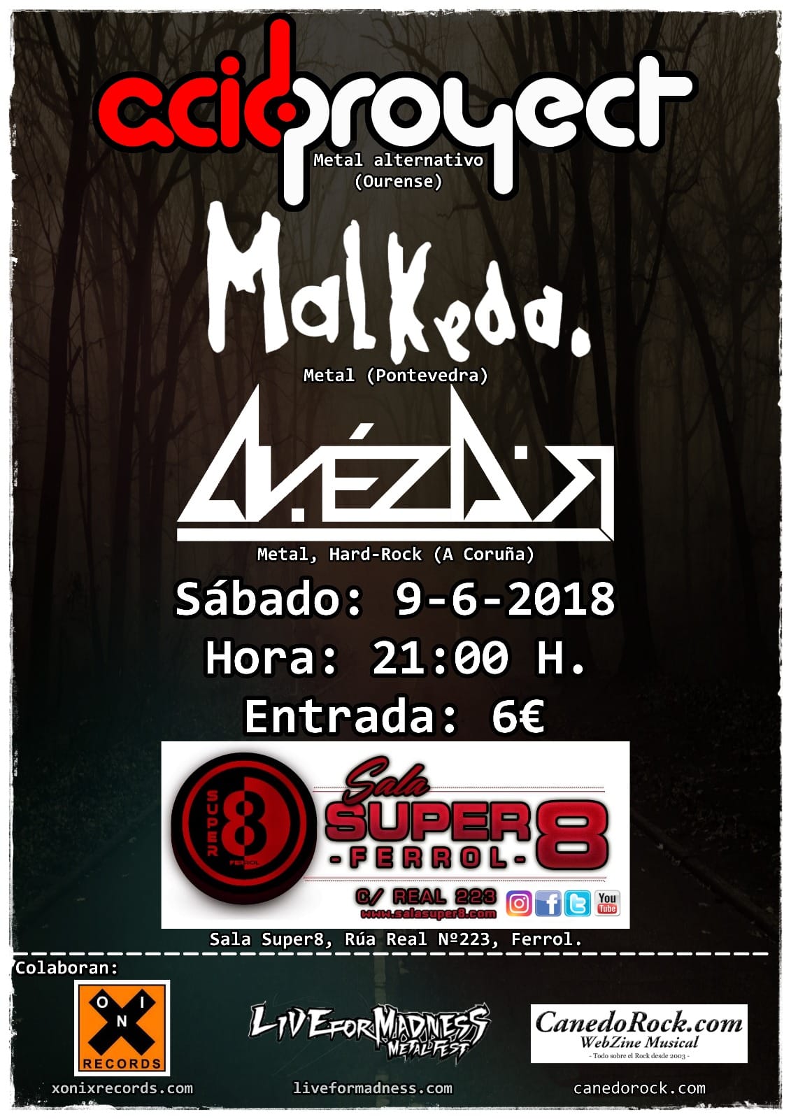 La bandas gallegas Acidproyect (Metal Alternativo, Ourense), Malkeda (Metal, Pontevedra) e Avézar (Metal-Hard Rock, A Coruña) estarán descargado todo su fuerza este próximo sábado 09 de junio en la Sala Super 8 de Ferrol.