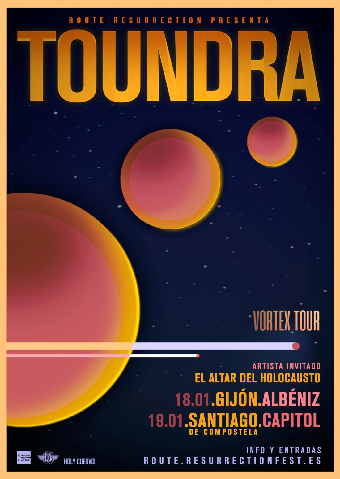 Con la llegada del nuevo año 2019, la ruta de camino al próximo Resurrection Fest recalará en la Sala Capitol de Santiago de Compostela. Será el día 19 de enero cuando el grupo madrileño Toundra, enmarcado en el llamado rock instrumental, presenten Vortex, quinto y último disco que les ha embarcado en una extensa gira por festivales y ciudades de media Europa durante el último año. El concierto contará además con la presencia, como artista invitado, del misterioso grupo peninsular El Altar del Holocausto quienes completarán con su estilo post-rock doom metalero una noche en la que la ausencia de voces centrará toda la atención de los asistentes en la creación puramente instrumental.