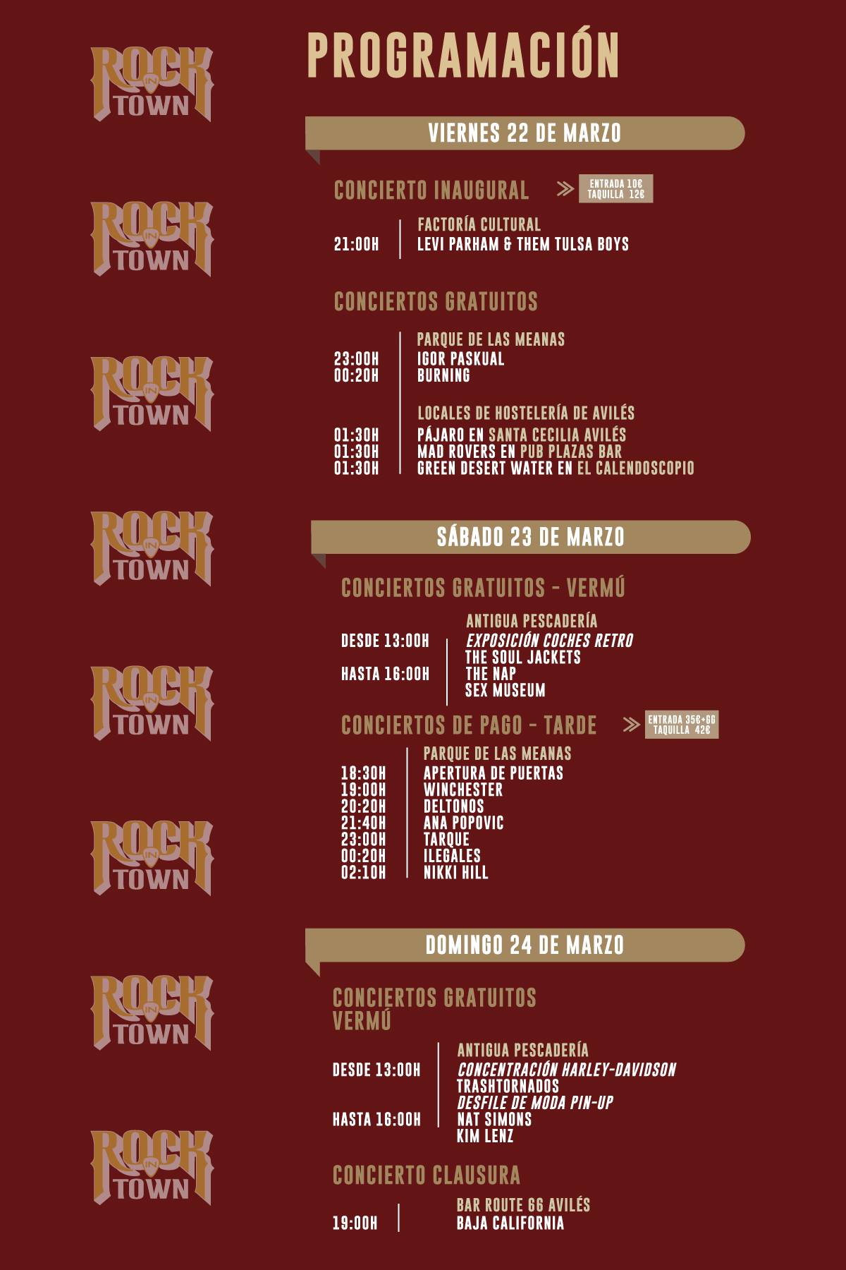El Parque de las Meanas, Antigua Pescadería, Palacio de Valdecarzana, Factoría Cultural, Plazas de Avilés, Don Floro, Santa Cecilia, Calendoscopio Café, y Le Garage son los lugares donde se celebrarán los conciertos y algunas de las actividades. Los conciertos se dividirán en los tres días siendo todos gratuitos excepto el show que tendrá lugar el sábado en el Parque de las Meanas en la que actuarán Nikki Hill, Ilegales, Tarque, Igor Pascual, Anna Popovic y Winchester y cuyas entradas podrán adquirirse a través de la página rockintown.es y Wegow.com y en los siguientes puntos de venta: Librería Paradiso en Gijón, Café Lord Byron en Avilés y La Bomba Records en Oviedo.