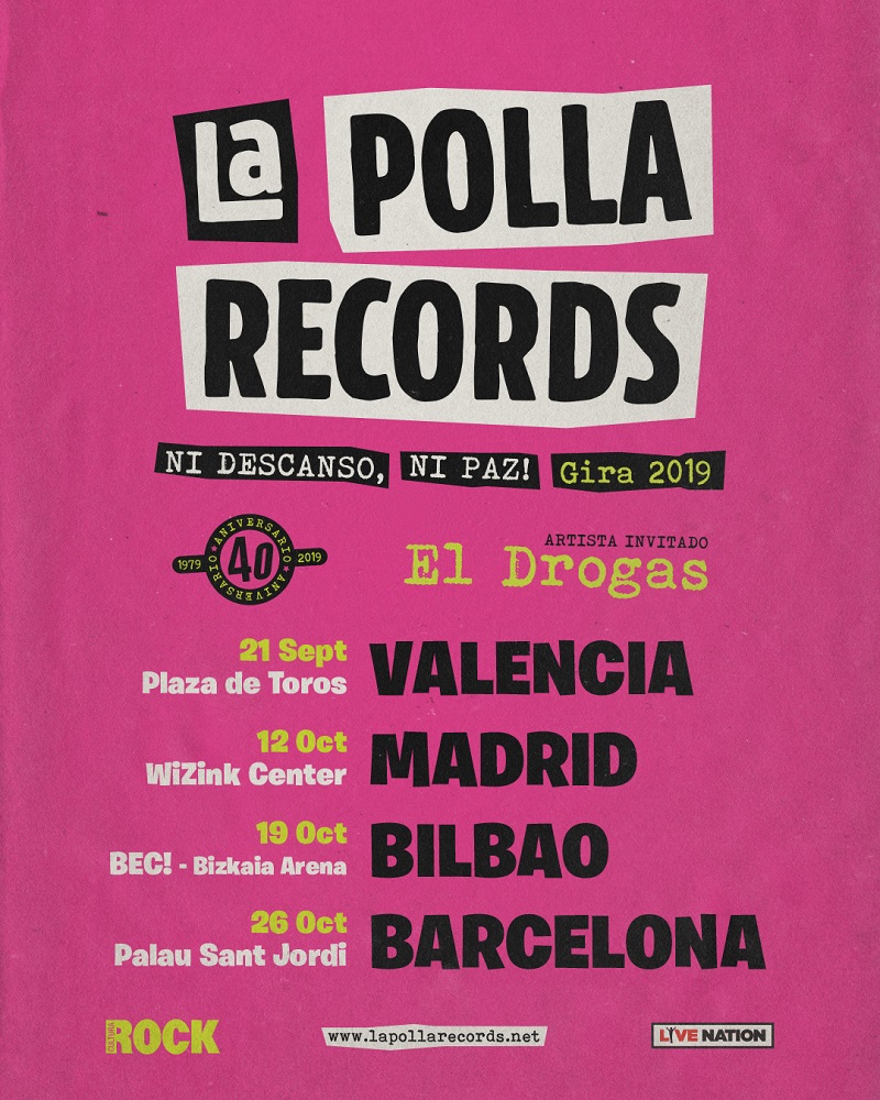 LA POLLA RECORDS realizará cuatro paradas en el estado dentro de su gira Ni descanso, ni paz!, con la que celebra su 40 aniversario: Valencia (21 de septiembre), Madrid (12 de octubre), Bilbao (19 de octubre) y Barcelona (26 de octubre). Asimismo, el tour incluirá 8 shows en distintos países de Latinoamérica, de los que próximamente se conocerán más detalles.