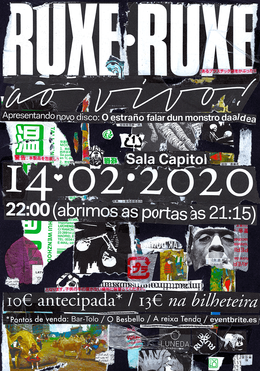 O vindeiro 14 de febreiro, Ruxe Ruxe, un clásico do rock galego por excelencia, están de volta presentando o seu novo disco, "O estraño falar dun monstro da aldea". A cita será na Sala Capitol de Santiago de Compostela. As entradas para este concerto xa se poden adquirir por 10€ en A Reixa Tenda, O Besbello, O Bartolo uo a través da web www.eventbrite.es