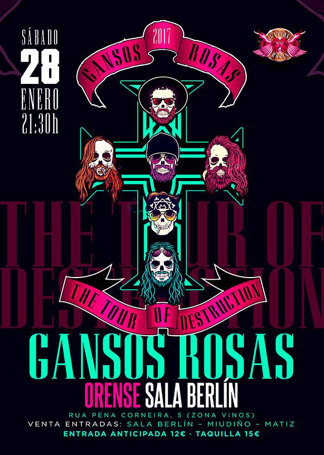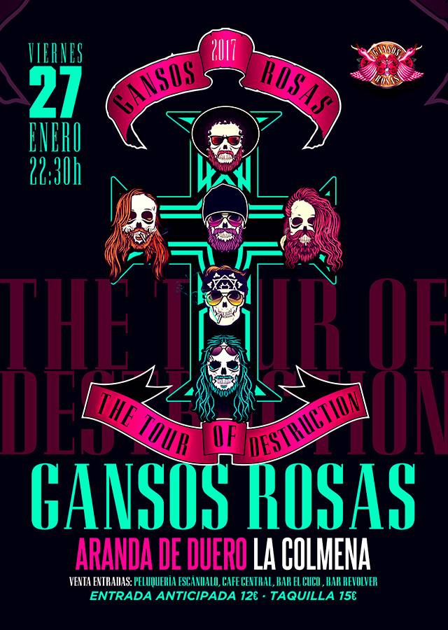 Gansos Rosas rendirá homenaje este año tan doblemente especial por la deseada gira mundial de Guns N' Roses, a su primer y más brutal disco '' Appetite for destruction'', el cual cumple 30 años desde que vio la luz y que cuenta con los temas más auténticos y emblemáticos de la banda.
