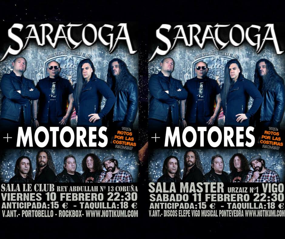 Los madrileños Saratoga viuelven a Galicia para sendos conciertos en A Coruña y Vigo dentro de la gira de presentación de su último disco "Morir en el bien, vivir en el mal". Les acompañarán en ambos los vi¡gueses Motores que continúan con su Tour "Rotos por las costuras" en la que también presentan su último trabajo que da nombre a su gira.