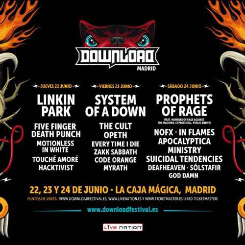 Continúa creciendo la primera edición de Download Festival Madrid, que se celebrará los días 22, 23 y 24 de junio y contará con LINKIN PARK, SYSTEM OF A DOWN y PROPHETS OF RAGE como cabezas de cartel.