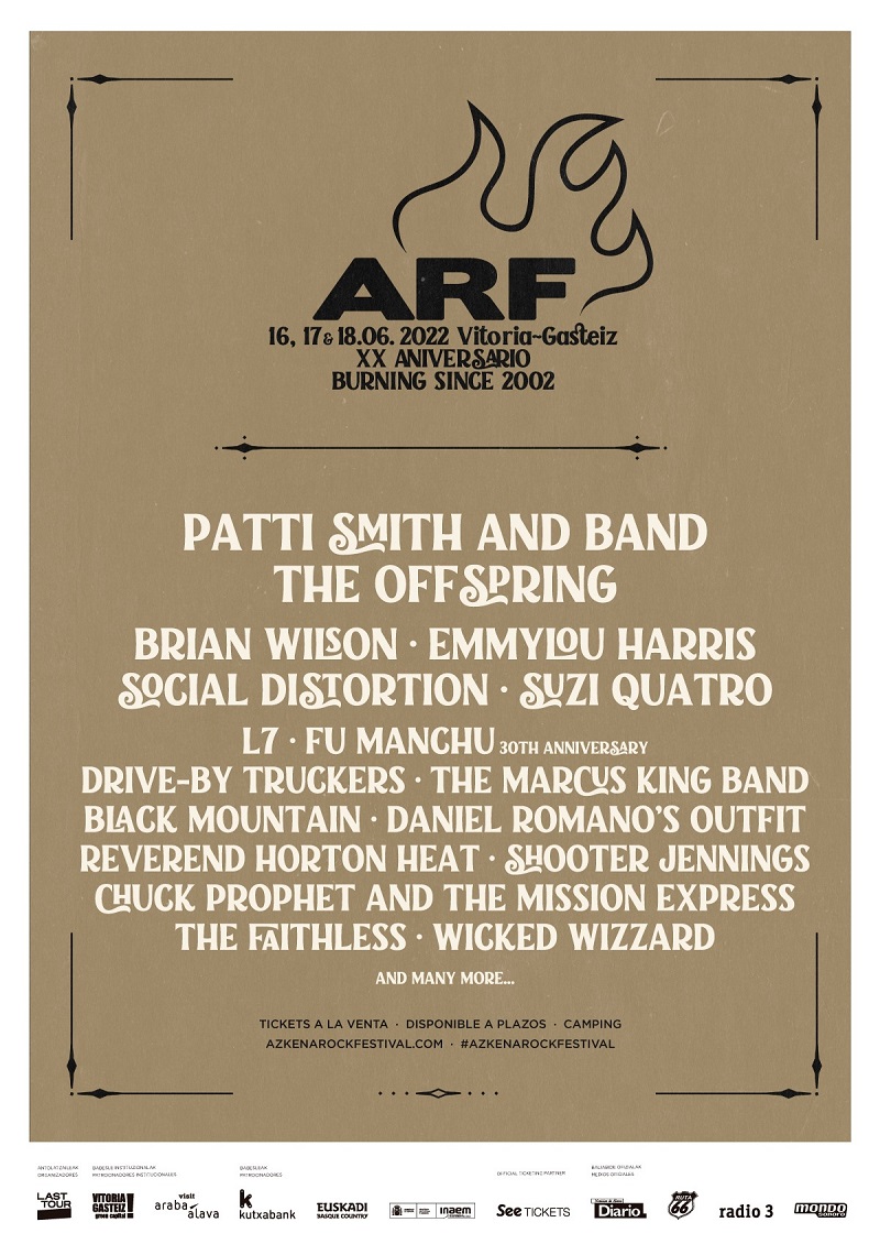 Hoy, el día en que se hubieran abierto las puertas del ARF 21, el festival anuncia los primeros nombres que se darán cita en Mendizabala el 16, 17 y 18 de junio de 2022. El festival celebrará su 20º aniversario con artistas de la talla de Patti Smith, The Offspring, Brian Wilson, Social Distortion, la leyenda del country Emmylou Harris, o una pionera del rock como Suzi Quatro, y bandas especialmente queridas por el público del festival como L7, Drive-by Truckers, Fu Manchu o Daniel Romano. Son solo algunas de la larga lista de estrellas del rock que pasarán, la mayoría en fecha exclusiva, por una edición especial de 3 días de música en un regreso a las raíces del festival.