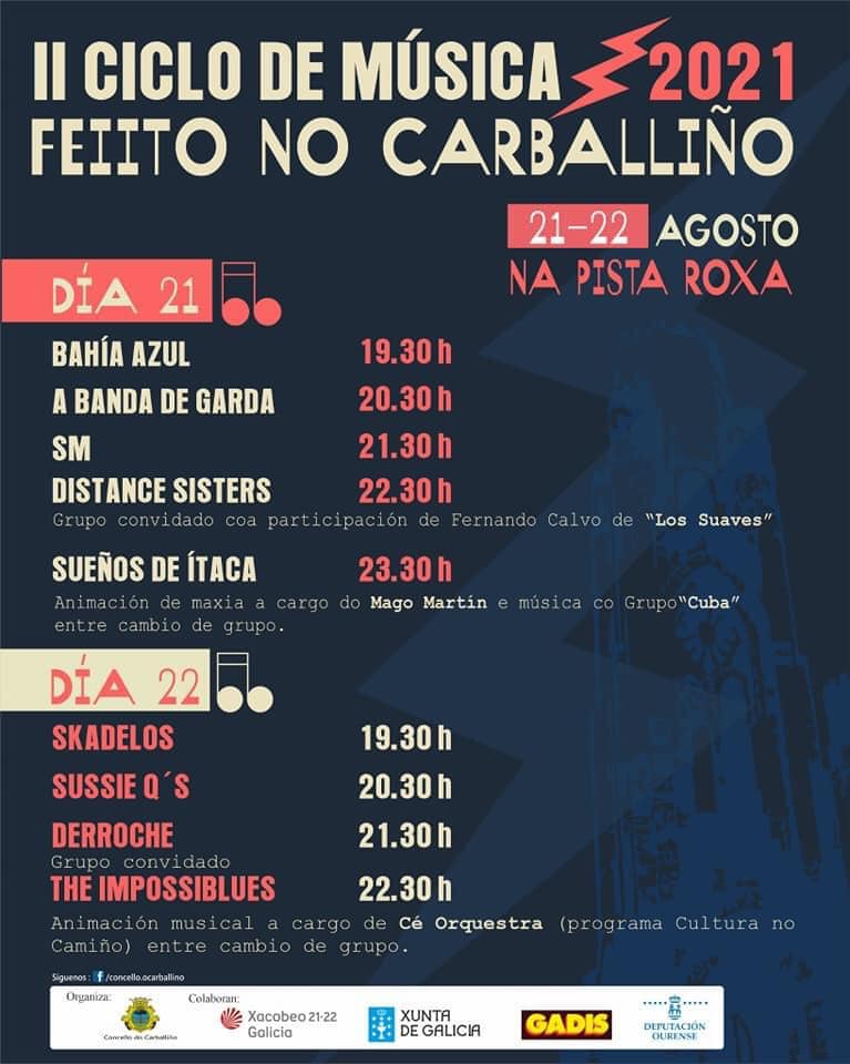 La segunda edición del Ciclo Musical Feito no Carballiño se celebrará este próximo fin de semana, sábado 21 y domingo 22, en la Pista Roxa de Carballiño (Ourense) con la participación de Bahia Azul, A Banda de Garda, SM, Distance Sisters y Sueños de Ítaca, el sábado, y de Skadelos, Sussie Q's, Derroche e Impossiblues, el domingo.