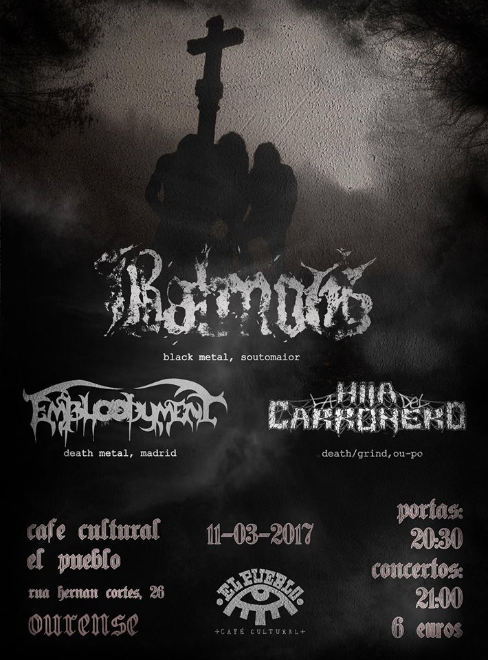 El Café Cultural El Pueblo acoge en la ciudad de As Burgas el concierto de Balmog, Embloodyment y La Hija del Carroñero. Black/Death/Grind desde Galicia y Madrid para el mundo a partir de las 20:30h con una entrada de 6€.