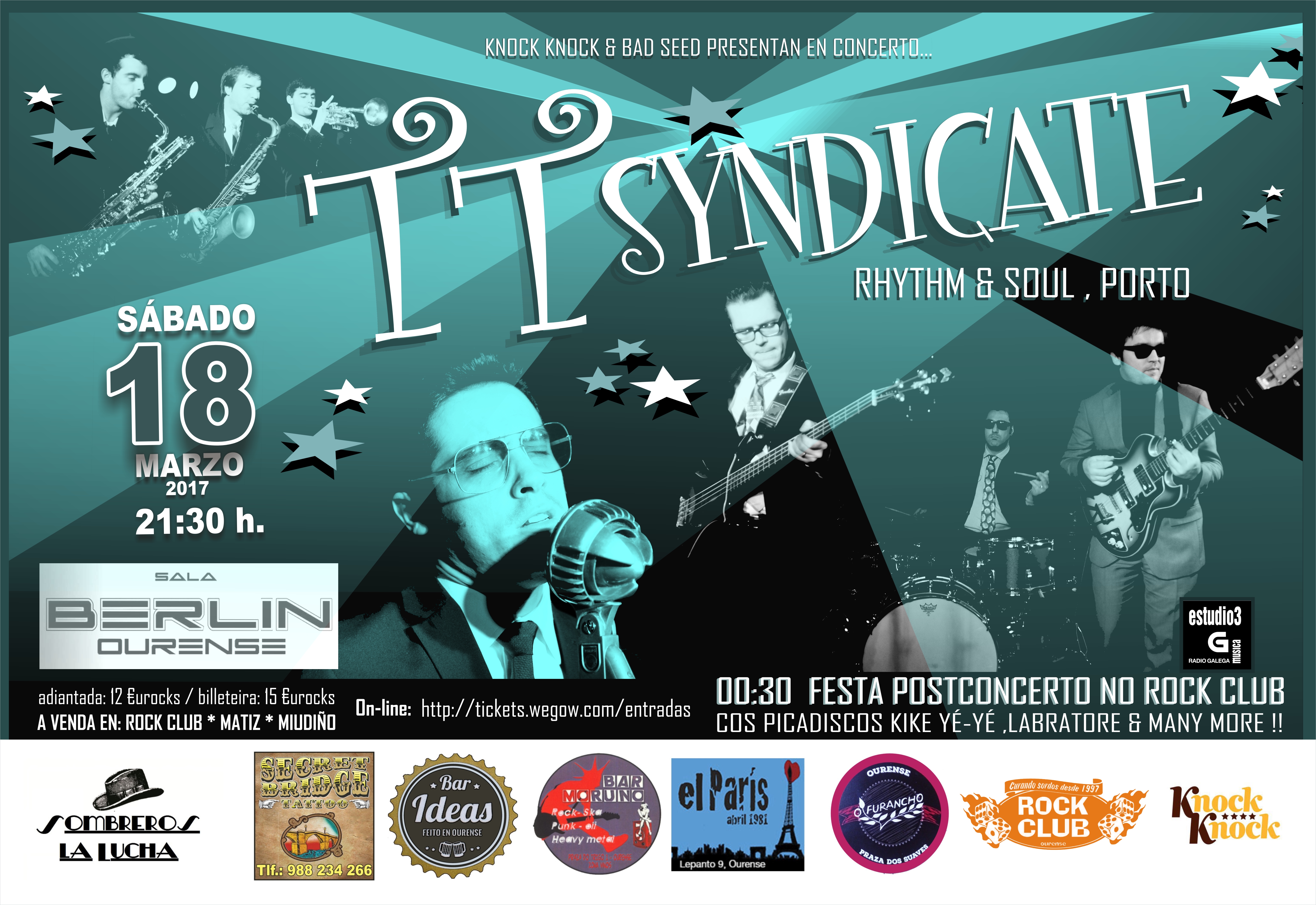 TT Syndicate es una explosiva banda ,formada en Oporto a principios de 2012 ,que convierte cada uno de sus directos en un espectáculo arrollador ,ante el que resulta materialmente imposible no rendirse. En sus filas militan algunos de los músicos más respetados de la escena lusa: Pedro Serra, Nuno Gómez, Nuno Riviera, Manuel Oliveira, Hugo Lopes,Joel y Bruno Rocha (conocidos en proyectos previos tan exitosos como The Mean Devils and 49 Special, Os Tornados o Thee Chargers). Ahora, reunidos en TT Syndicate, descargan en cada tema toda la autenticidad del rhythm&blues, el northern soul y el beat de los 60... En apenas tres años se han convertido en una de las mayores sensaciones del Rhythm & Soul europeo.