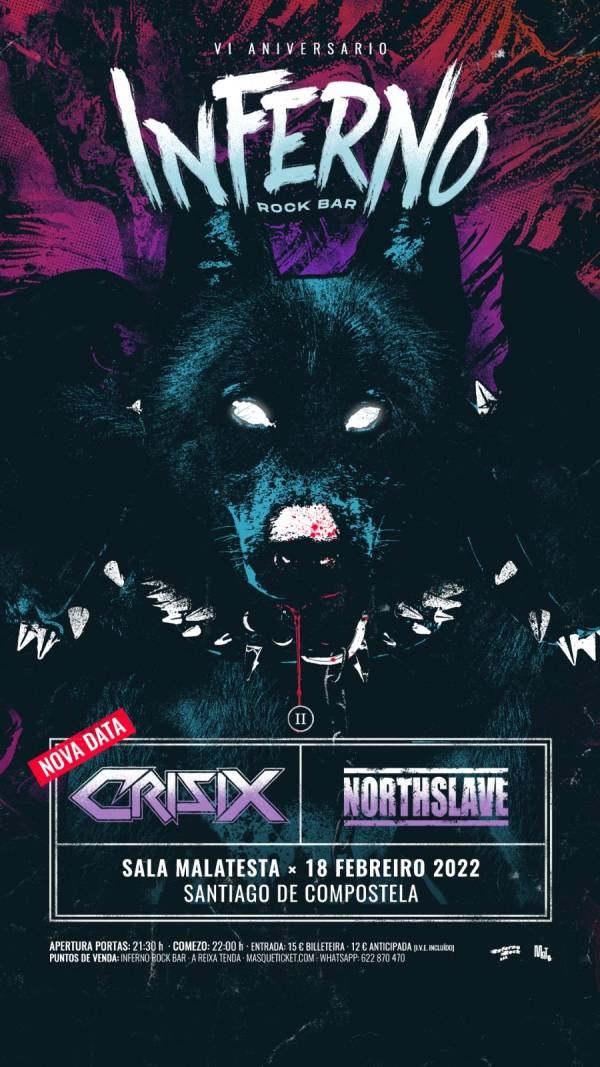 Los catalanes Crisix recalarán en la Sala Malatesta de Santiago de Compostela para descargar su thrash metal de vieja escuela presentando "The Pizza EP", prolegómeno del que será su quinto disco de estudio, "Full HD", que saldrá en primavera de este año. Los de Igualada se han convertido en uno de los referentes más importantes de nuestro país en el género. La "joven" banda local NorthSlave de metal alternativo actuará de telonero con muchas ganas de abrirse paso en la escena metal gallega.