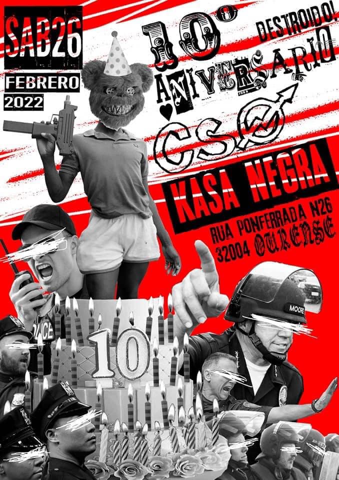 O CSO A Kasa Negra de Ourense celebra o seu décimo aniversario ao grande. Concertos, Djs, Clows, actividades infantís e moito máís é o podremos disfrutar o vindeiro 26 de febreiro na Kasa Negra desde as doce da mañá na que comezarán cunha sesión vermu e pinchada de vinilos.