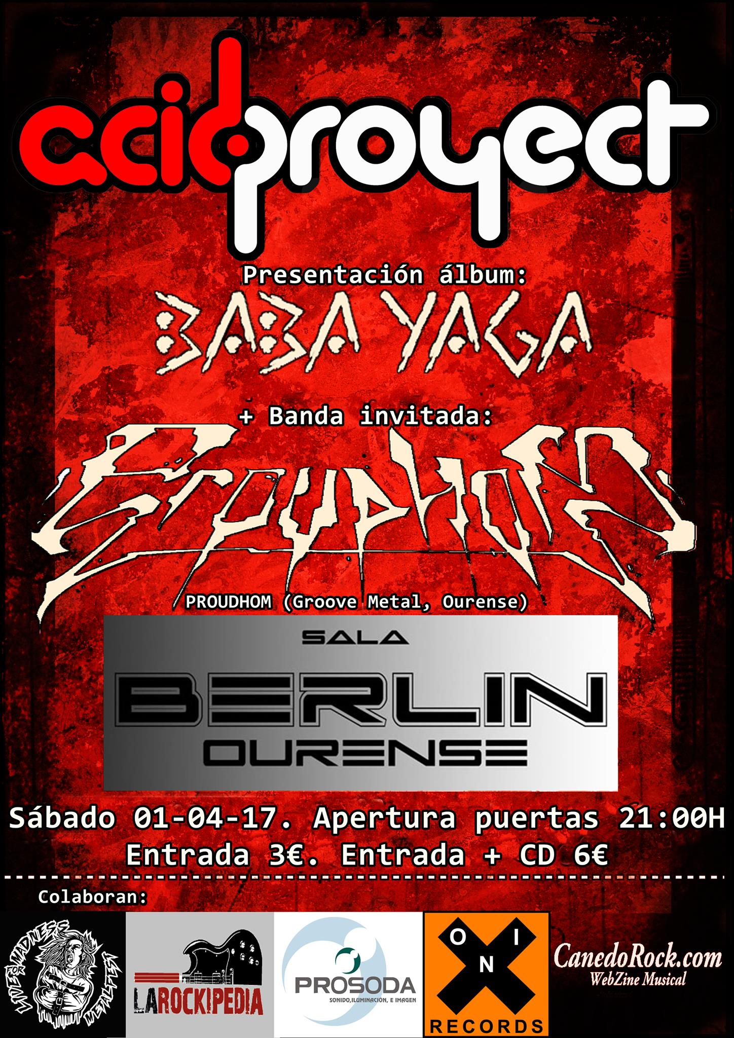 La banda ourensana de Metal Alternativo Acidproyect presenta en casa su nuevo disco "Baba Yaga" y lo hace con un concierto en la Sala Berlín de la ciudad de As Burgas. Será este próximo sábado 01 de abril a partir de las 21:00h. El Thrash Groove de otros ourensanos ProudHoM, será el encargado de calentar el ambiente. Las entradas tienen un precio de sólo 3€ (6€ con Cd).