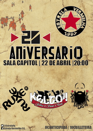Ruxe-Ruxe, Keltoi! y Xenderal serán las actuaciones encargadas de firmar, el sábado 22 de abril, en la Sala Capitol de Santiago de Compostela, el XX Aniversario del Estrela Vermelha. El club de fútbol gaélico, de la comarca de Compostela, cumple 20 años de pasión, deporte y compromiso que merecen una celebración por todo lo alto.