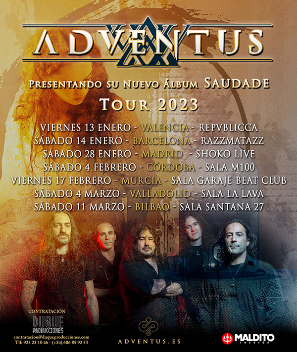 Adventus, la banda de Heavy Metal asturiana, volverá a girar por las salas del territorio nacional defendiendo su nuevo álbum de estudio titulado "Saudade". La banda metalera regresa a los escenarios con un directo potente en el que se incluirán los temas nuevos junto a los del anterior disco.