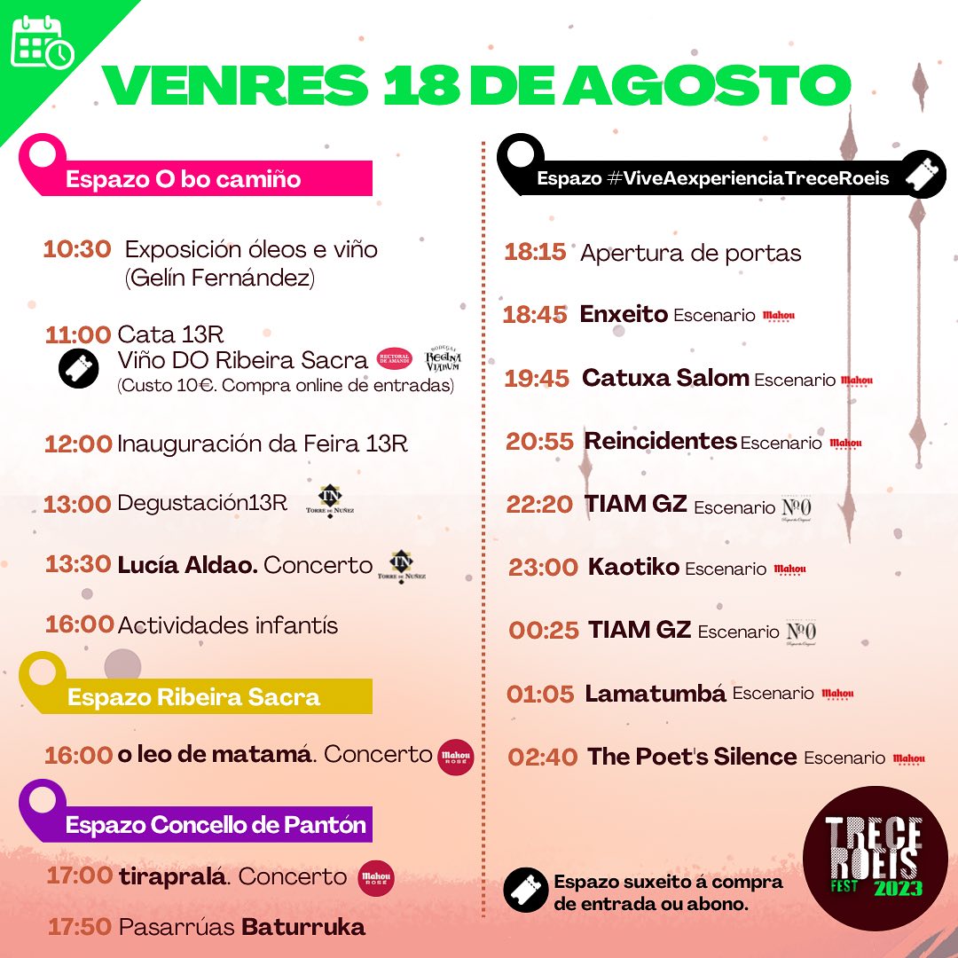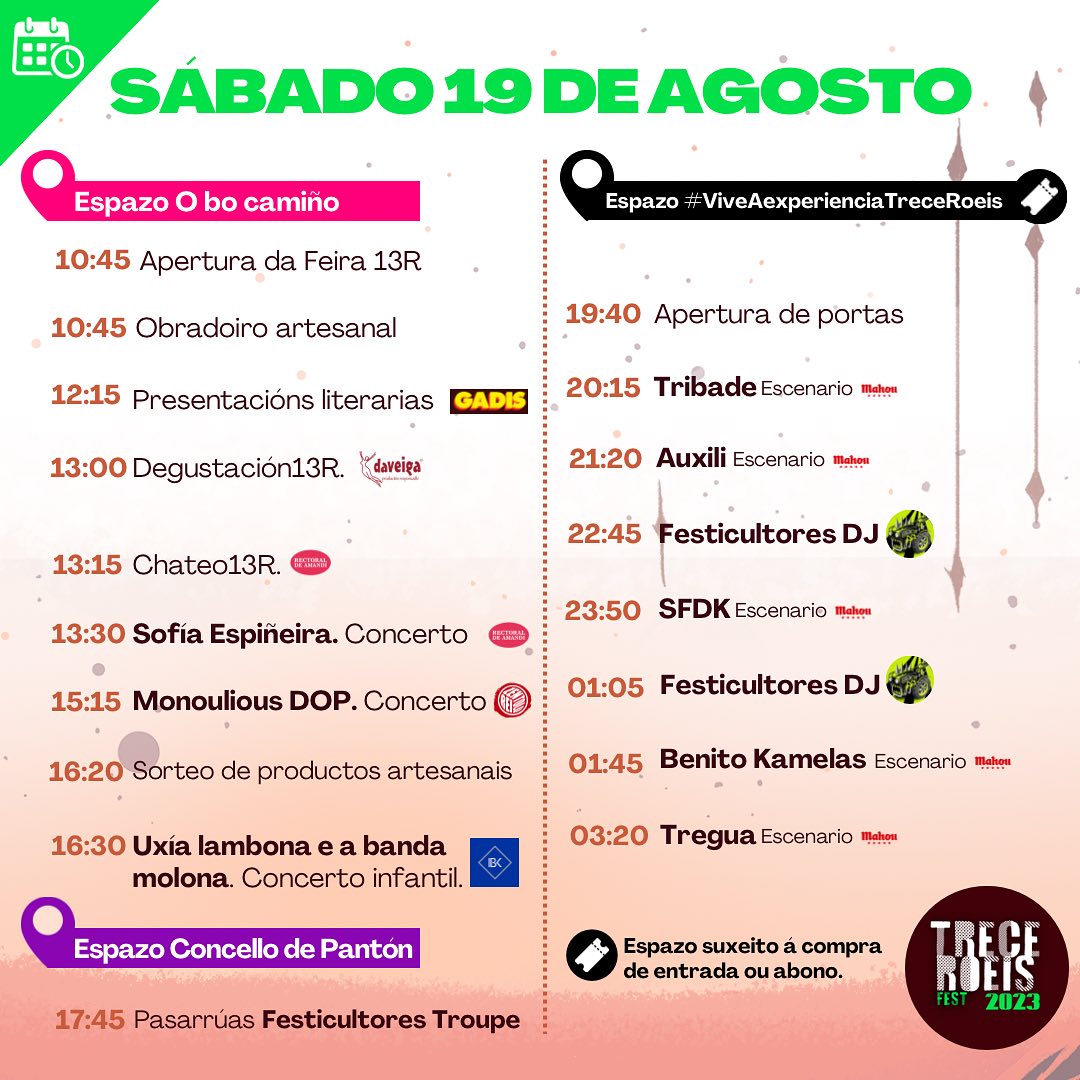 El Trece Roeis Fest 2023 se celebrará los días 18 y 19 de agosto como en otras ocasiones en el Campo Municipal de Ferreira de Pantón (Lugo) con bandas como SFDK, Reincidentes, Kaotiko, Benito Kamelas, Lamatumbá, Tregua, Festicultores, The Poets Silence o Enxeito, hasta 18 artistas confirmados.