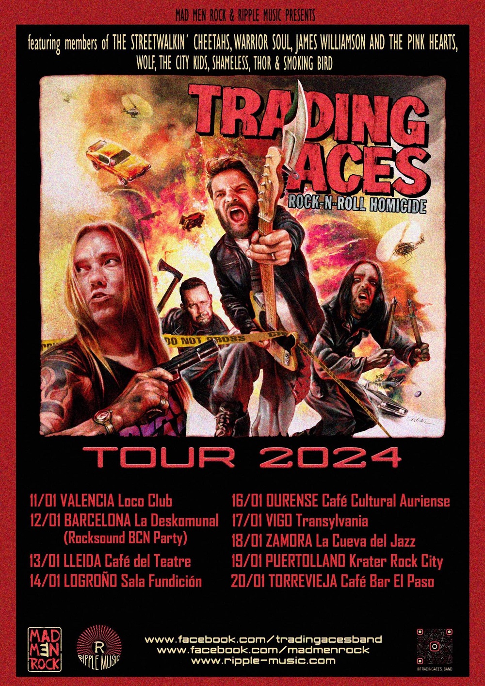 En su visita anterior, la banda dejó una huella imborrable con una gira de 10 fechas para celebrar el lanzamiento de 'Rock 'n' Roll Homicide', un álbum que no solo recibió elogios de la crítica, sino que también atrajo la atención de algunos de los medios especializados más destacados de España. La respuesta apasionada de los fans y la prensa ha motivado a Trading Aces a regresar para dar rienda suelta nuevamente a su sonido audaz y contundente con sus directos.
