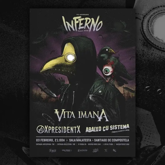 Continúa la serie de conciertos que forma parte de la celebración del VIII aniversario del picheleiro Pub Inferno, uno de los pocos reductos del rock que resisten el paso del tiempo en la capital de Galicia y que, año tras año, está empeñado en celebrar sus cumpleaños a lo grande: con un festival de música. XpresidentX, Abaixo Cu Sistema, Vita Imana y Manifa, en la segunda cita, con sonidos del punk, del rock y del metal, que se celebrará mañana sábado 3 de febrero, en la Sala Malatesta de Santiago de Compostela.