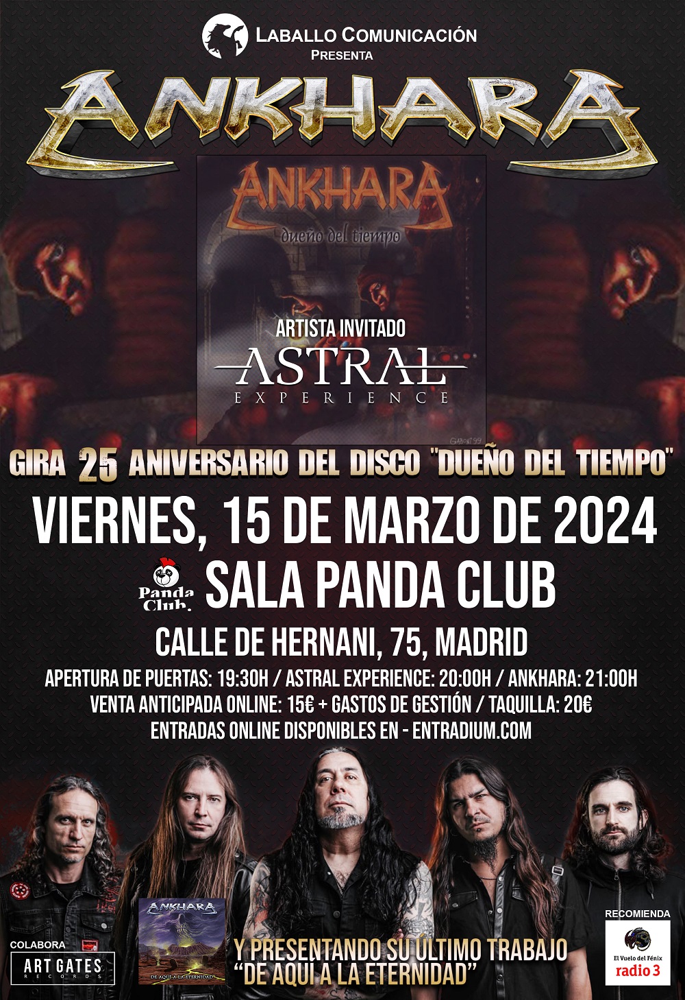 El concierto se realizará en la sala Panda Club de Madrid, donde Ankhara tocará su primer disco " Dueño del Tiempo " en su totalidad, y por supuesto, también presentarán su nuevo EP " De Aquí a la Eternidad ". Y además para la ocasión contarán con una gran banda de su sello Art Gates Records; desde Valencia: Astral Experience.