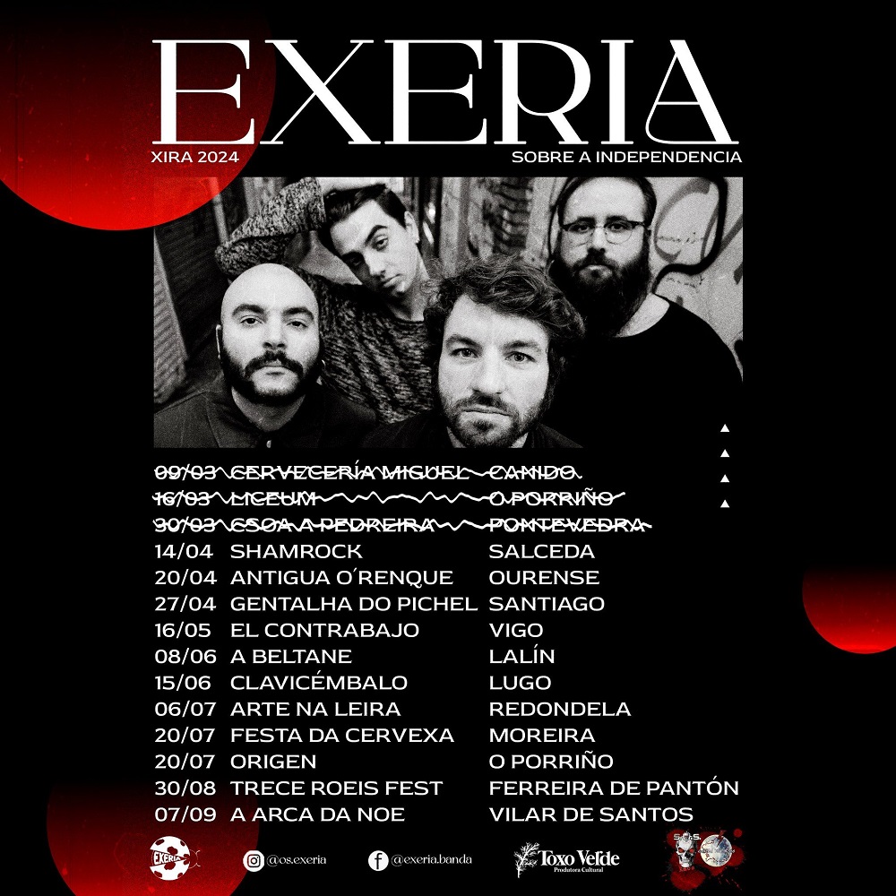 O 2023 foi un ano moi produtivo para Exeria: tocaron nas 4 provincias de Galicia, gañaron o concurso de bandas Trece Roeis Fest, publicaron os temas Un novo nome e Ata que sexamos reis acompañados de videoclips ben recibidos. E este ano vai ser aínda máis emocionante, con moitos concertos en directo e novos lanzamentos. Foron elixidos para formar parte das Desktop Sessions, un formato acústico e en directo ao estilo de “Tiny Desk” cun ambiente relaxado e composto por 2 cancións inéditas con arranxos influenciados polo trad.
