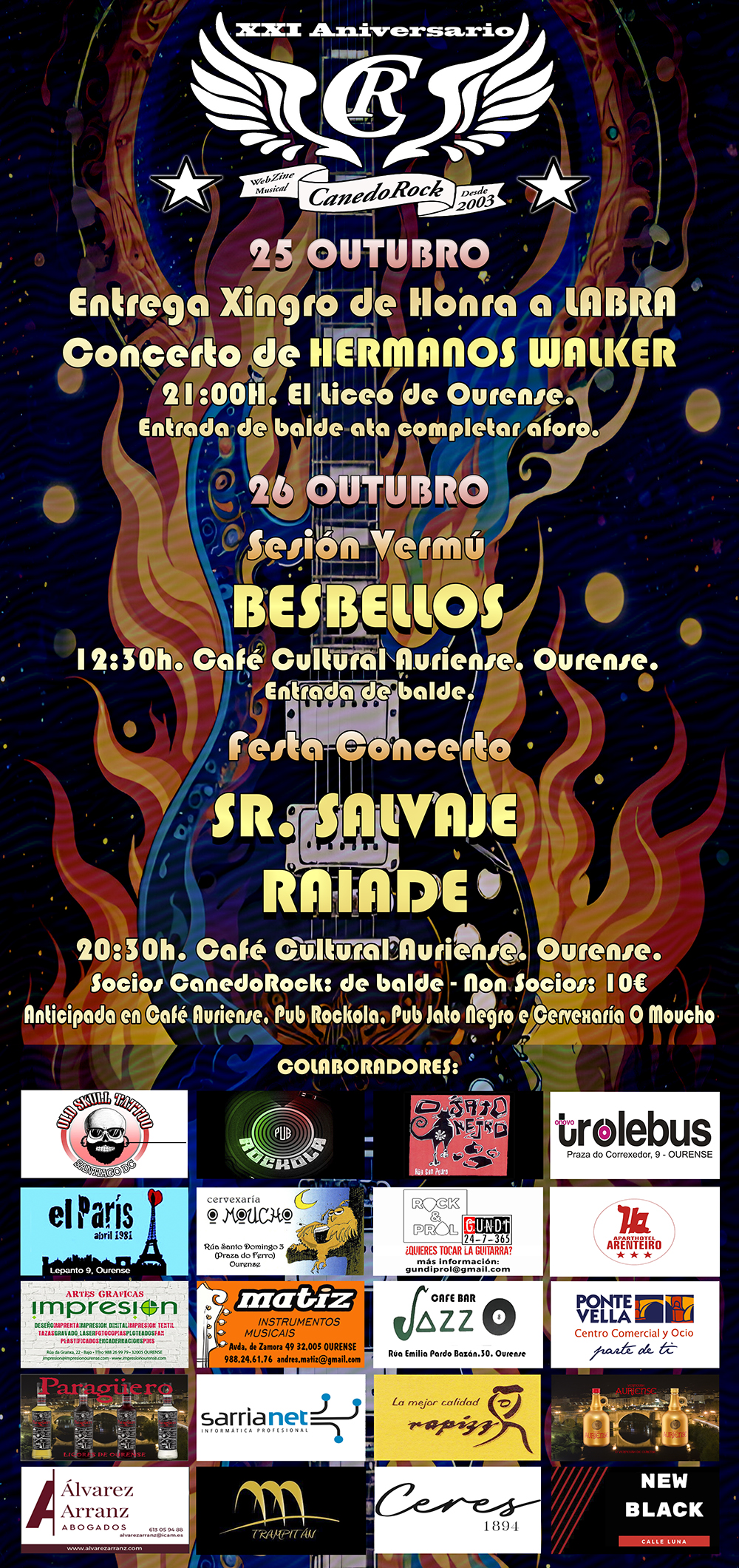Las entradas están la venta a un precio de 10€ en Café Cultural Auriense, Pub Rockola, Pub Jato Negro y Cervexaría O Moucho. (Socios CanedoRock: entrada gratuita).