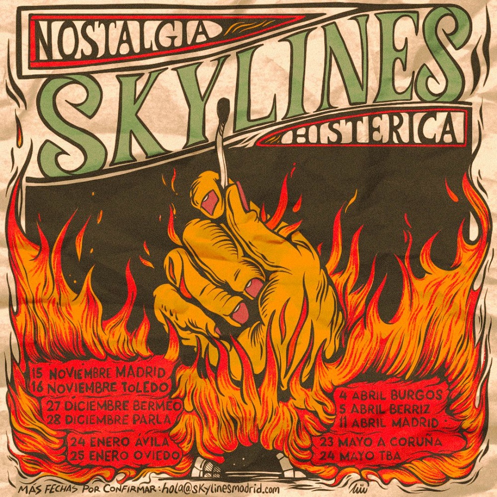 Tras su vuelta a los escenarios en Madrid y Toledo, el trío de punk rock madrileño Skylines anuncia nueve nuevas fechas de aquí a finales de mayo. Llevarán por buena parte de la península su disco "Nostalgia Histérica", por ciudades como Bermeo, Ávila, Oviedo, Burgos o A Coruña...