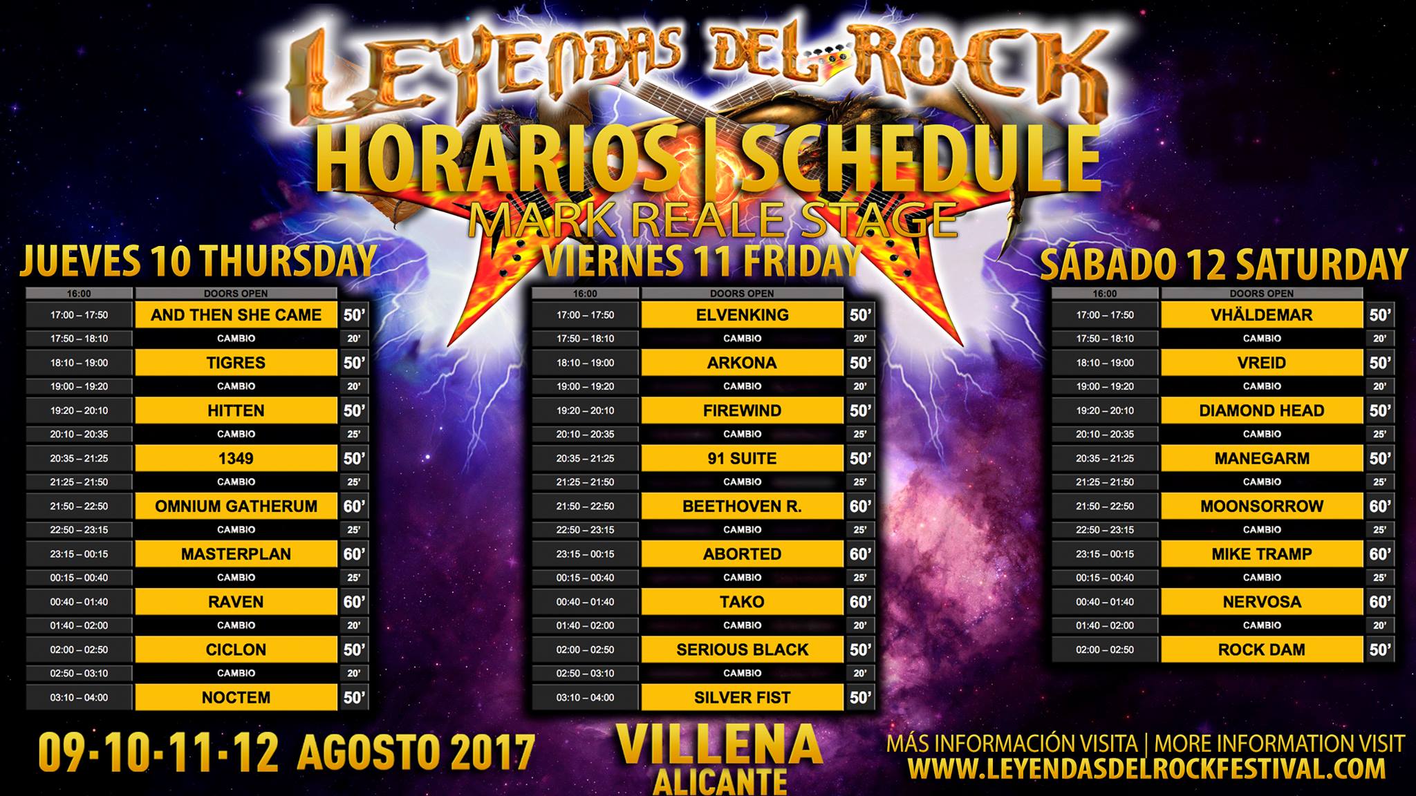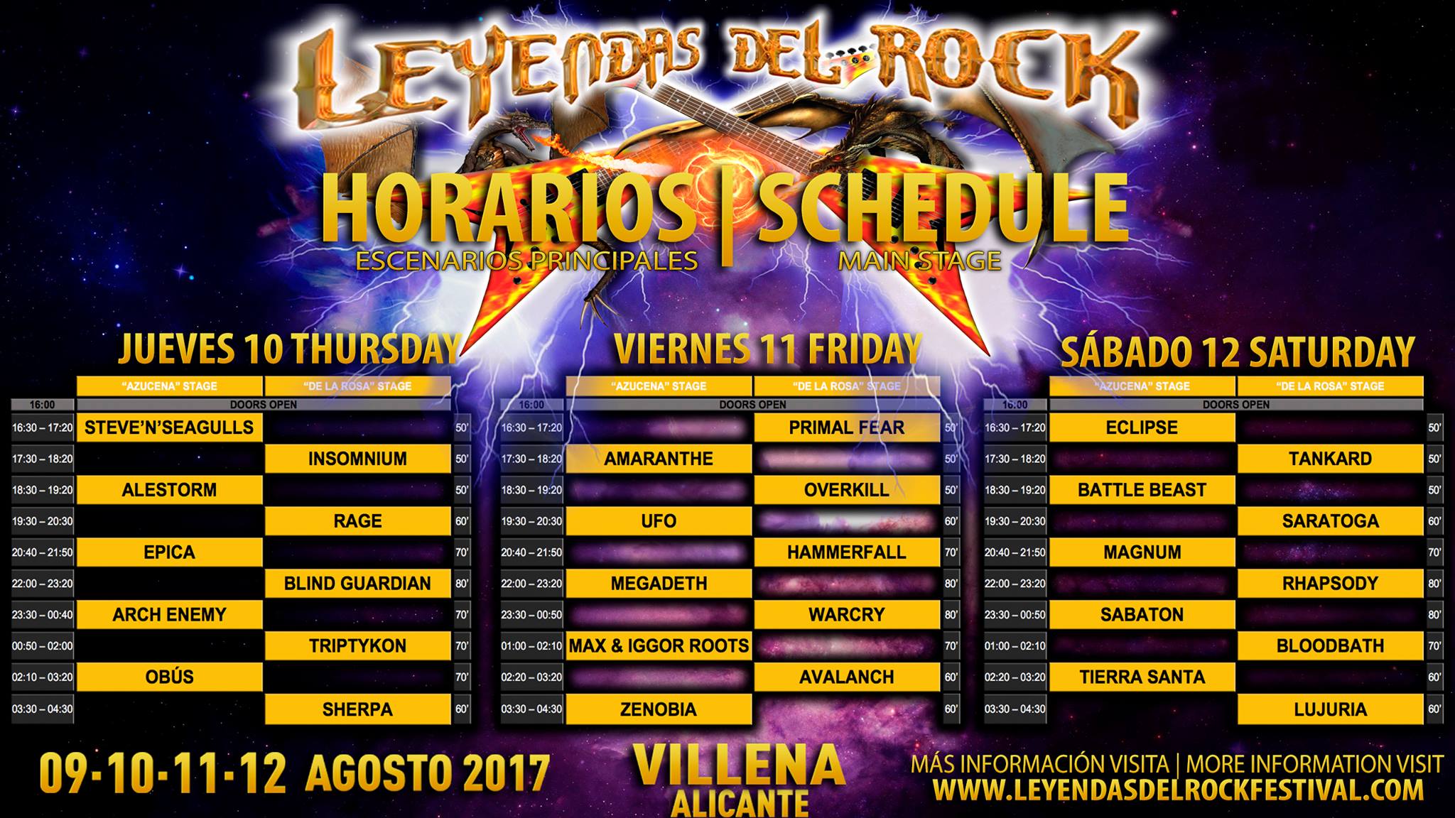 Os dejamos los horarios de actuación de los tres escenarios ubicados dentro del recinto del festival de Villena. En breve anunciarán los horarios de los conciertos acústicos de la plaza mayor de Villena, Avalanch y Mike Tramp (ex White Lion), y de los del conciertos del camping.
