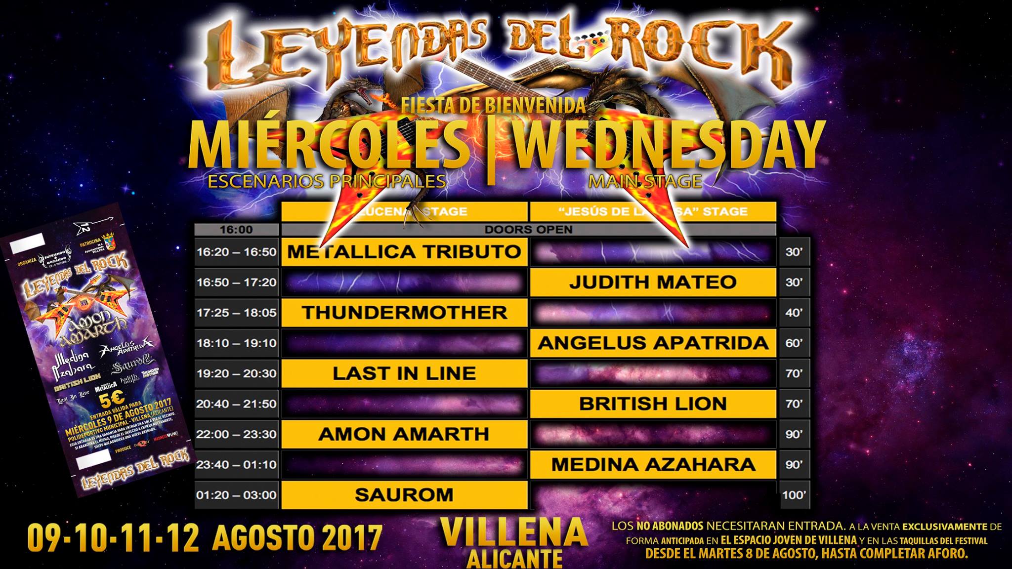 La decimosegunda edición del festival Leyendas del Rock se celebrará los días 9, 10, 11 y 12 de agosto de 2017 en Villena (Alicante). Un espacio privilegiado donde se puede disfrutar de césped natural, piscina, arbolado, ludoteca y otra serie de servicios que lo convierten en uno de los mejores recintos de España. El precio definitivo de los abonos es de 100 euros + gastos de distribución, 55 euros el día suelto. También se encuentra a la venta el abono camping sombra. Los abonos para la piscina están agotados.