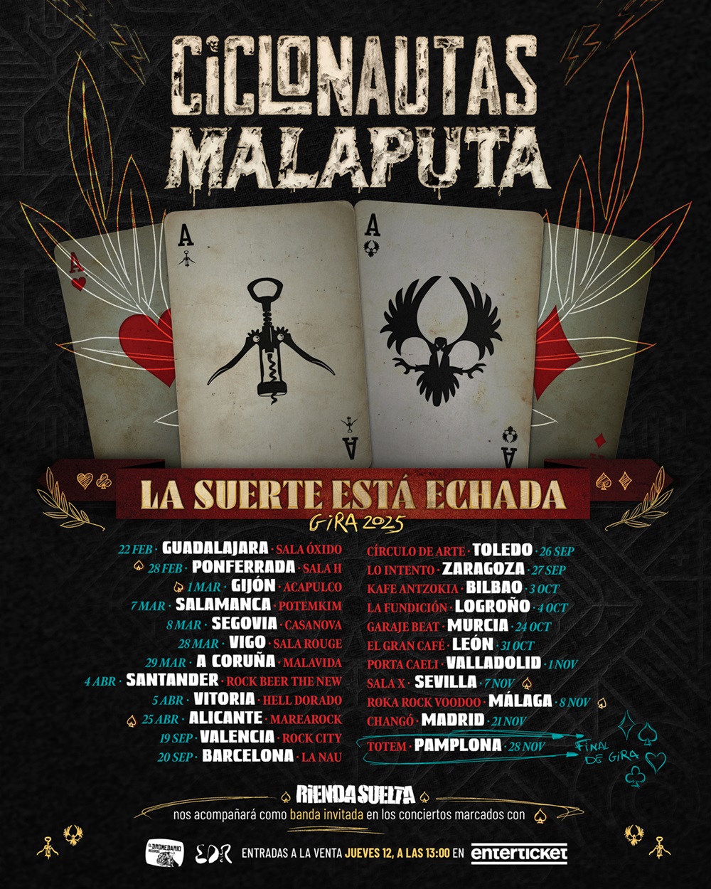 El disco se presentará en Ponferrada, Gijón, Alicante, Sevilla y Málaga, en el marco de la gira “La suerte está echada” de Ciclonautas y Malaputa, entradas a la venta aquí.