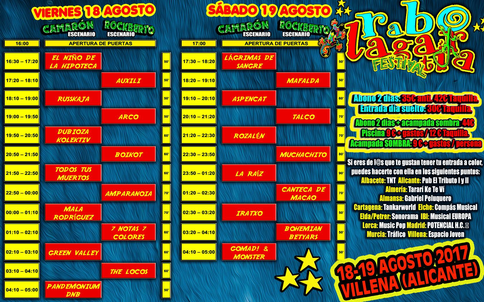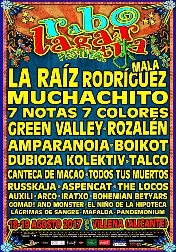 Después de la buena acogida que ha tenido el festival en los dos primeros años, el Rabolagartija 2017 ya es una realidad, se celebrará los días 18 y 19 de agosto en el Polideportivo Municipal de Villena, un magnífico recinto que cuenta con campo de fútbol de cesped natural, piscinas, zonas arboladas y amplios espacios para hacer muy agradable la estancia en el mismo. Contaremos con dos escenarios de gran tamaño, "Camarón" y "Rockberto", que se irán alternando de manera que la música en directo no pare ni un momento durante todo el evento.