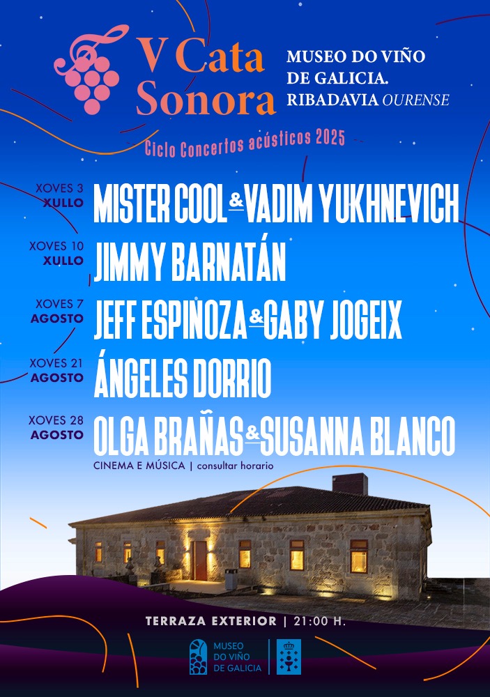 Por quinto ano consecutivo terá lugar no Museo do Viño de Galicia unha nova edición da “Cata Sonora”, un ciclo de concertos de moi diversos xéneros musicais que contará con artistas tanto da comunidade como nacionais e que compartirán o seu talento nun recinto incomparable e de gran beleza como é a terraza exterior do museo.