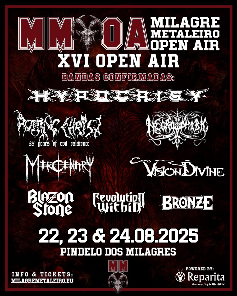 Hypocrisy serán los cabezas de cartel en la próxima edición del Festival portugués, pero no son la única confirmación. Rotting Christ, Vision Divine, Necrophobic, Mercenary, Blazon Stone, Revolution Within y Bronze completan está primera tanda de anuncios del Milagre Metaleiro Open Air 2025