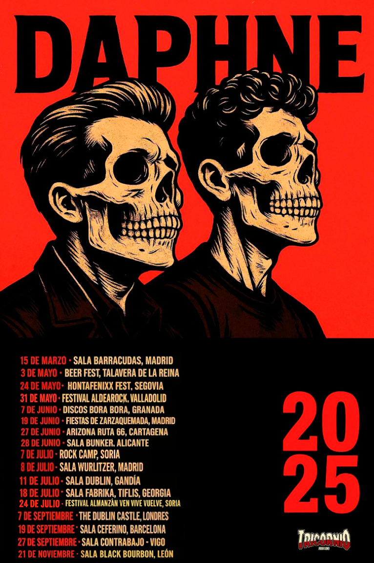 Daphne es un powerduo de rock alternativo originario de Madrid, formado por Marcos Cabello (bajo y voz) y Jesús Rivera (batería y coros) con una propuesta única: solo bajo y batería, pero con una fuerza y energía arrolladora.