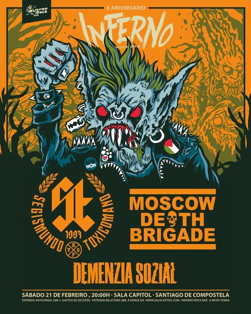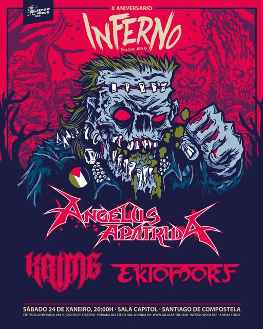 Angelus Apatrida y Moscow Death Brigade, entre otros, actuarán en dos citas, con sonidos del punk, del rock y del metal, que se celebrarán, en los meses de enero y febrero del futuro 2026, en la Sala Capitol de Santiago de Compostela. Una serie de conciertos que forma parte de la celebración del X aniversario del picheleiro Pub Inferno, uno de los pocos reductos del rock que resisten el paso del tiempo, en la capital de Galicia, y que, año tras año, está empeñado en celebrar sus cumpleaños a lo grande: con un festival de música.