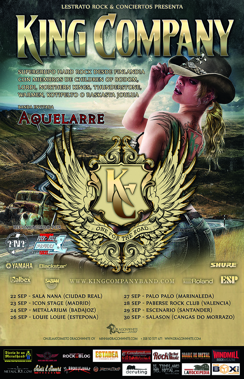 El supergrupo finlandés King Company cierra su visita a la península el próximo sábado 30 septiembre en la Sala Son de Cangas do Morrazo. La banda cuenta en sus filas con músicos que han estado en grandes bandas finlandesas como Children of Bodom, Lordi, Northern Kings, Thunderstone, Warmen, Kotipelto o Raskasta Joulua.