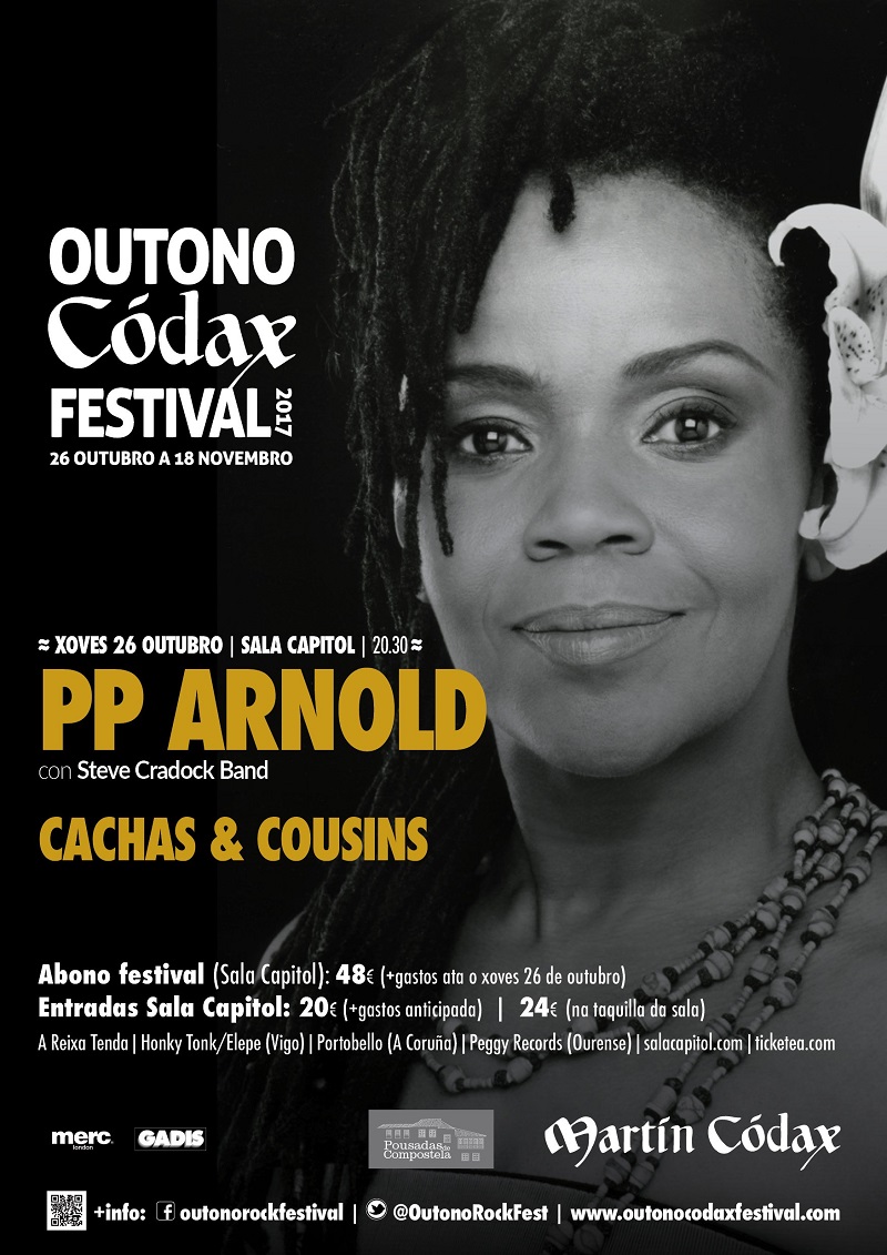 El Outono Códax arranca este jueves su VII edición con PP Arnold, leyenda icónica de la escena británica de los 60. La prodigiosa voz de Arnold, una de las leyendas de la escena británica y que estará acompañada de los miembros de la Steve Cradock Band, llega por primera vez a Galicia, dentro de la gira de celebración de sus 50 años en la industria de la música.