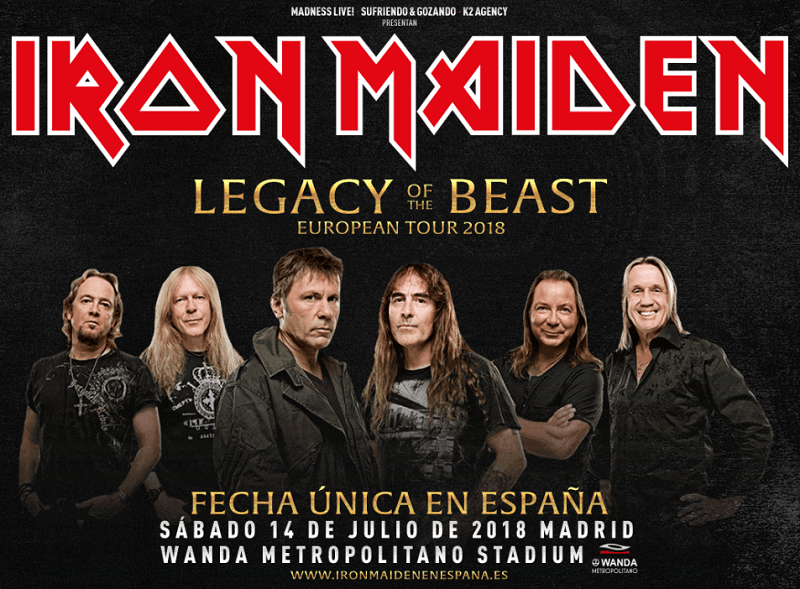 Tras el espectacular éxito de la gira internacional de 2016-17 para presentar su decimosexto álbum de estudio, The Book Of Souls, IRON MAIDEN se echará de nuevo a la carretera en 2018 para dar una serie de conciertos en festivales y estadios de Europa dentro de la gira mundial «Legacy Of The Beast» que comenzará en Tallin (Estonia) el 26 de mayo y finalizará el 10 de agosto en el o2 Arena de Londres. Esta única fecha en España, tendrá lugar el próximo sábado 14 de Julio de 2018 en el Estadio Wanda Metropolitano de Madrid.