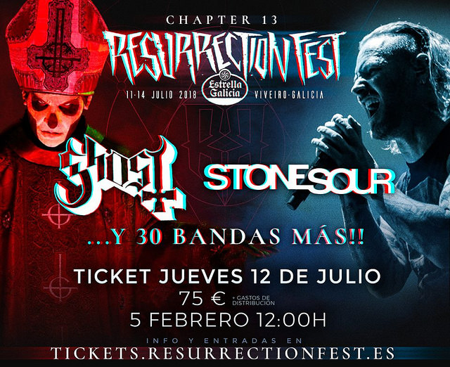 Desde hoy 5 de febrero a las 12:00 del mediodía se pondrán a la venta las entradas diarias para el jueves 12 de julio, día de actuación de Ghost y Stone Sour, además de otras 30 bandas que conforman el cartel para ese día, las cuales se anunciarán más adelante con la distribución por días. El precio de este día será de sólo 75 € + gastos y se podrán comprar sólo en la web del Festival.