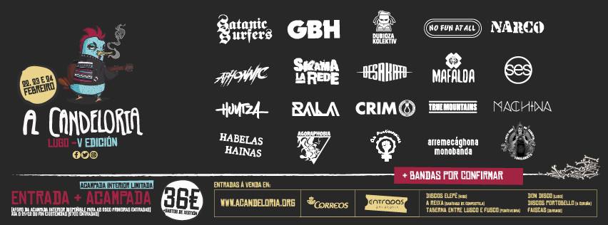 El festival lucense A Candeloria tiene casi cerrado el cartel de V edición, a falta de dos bandas. GBH, Satanic Surfers, Dubioza Kolektiv, SES, Narco, Desakato, Aphonnic, Mafalda, Agoraphobia, True Mountains, Leo Arremecaghona, Machina, Bala, Huntza, Crim, Non Fun At All, Habelas Hainas, Skama la Rede, As Punkiereteiras y O Puto Coro do Exercito Froilanista son la veintena de bandas que conforman hasta ahora esta edición 2018 de la que ya están vendidas mas de 1000 entradas.
