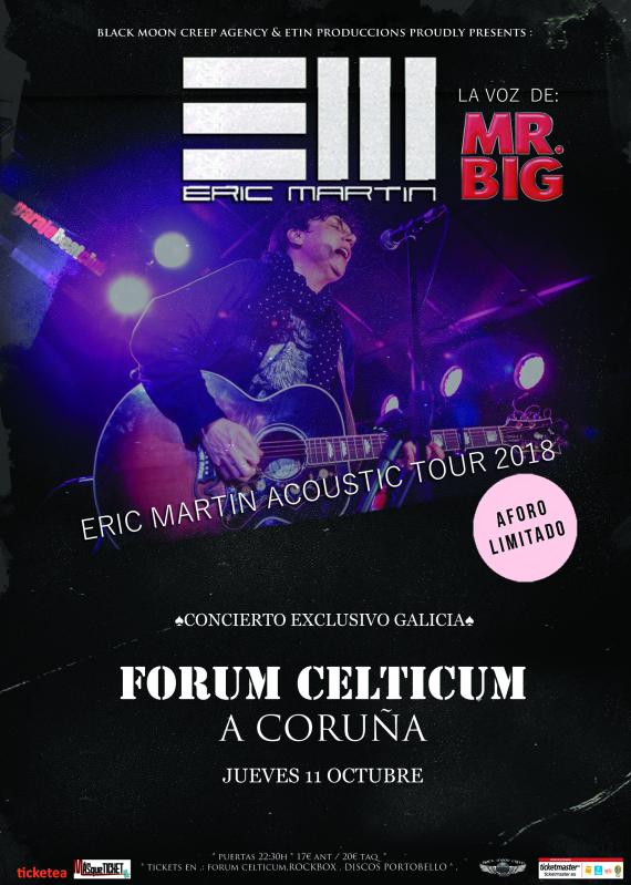 Eric Martin , la virtuosa voz de los americanos Mr.Big llega a Galicia para un show exclusivo en el Forum Celticum de A Coruña. El aforo será limitado, con un pequeño cupo de entradas para un show intimo al lado del artista, todo un privilegio.