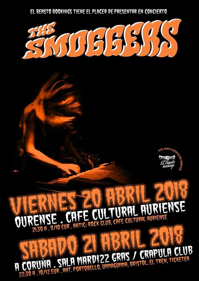 Tras casi una década subiéndose a los escenarios y una decena de trabajos de estudio (en diferentes formatos) a sus espaldas, podemos decir que estamos ante una de las bandas nacionales más consolidada y con mejor cartel de la escena garajera patria. The Smoggers son sin duda dignos herederos del mejor garaje revivalista de los 80’s. Siguiendo los pasos de sus ídolos del pasado (The Sonics, The Fuzztones, The Morlocks...), han sabido rescatar como nadie la esencia de ese sonido y traerlo a la actualidad, para convertirse en una de las bandas más reputadas a nivel europeo en cuanto a sonido fuzz y teclado Vox se refiere. Su participación en los más prestigiosos festivales europeos les avalan, así como sus numerosas actuaciones a lo largo de Inglaterra, Alemania o Francia.