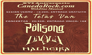 El sábado 05 de octubre CanedoRock celebramos nuestros 16 años en la red de redes, como siempre, con buena música. En esta ocasión nuevamente nos acompañarán cuatro grandes bandas, Pölisong, Dagla, Malheira y The Tetas' Van. Apostando por bandas de Galicia y de nuestra ciudad en especial, y más en una época en la que parecen cernirse negras nubes para la cultura en general de la otrora Atenas de Galicia.