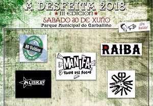 Este próximo sábado 30 de junio se celebrará la tercera edición de A Desfeita. El Festival de Carballiño contará con las bandas Manifa (punk-rock), Raiba (metal), Liska! (Ska), 80 voltios (rock) y Innoppiah (punk).