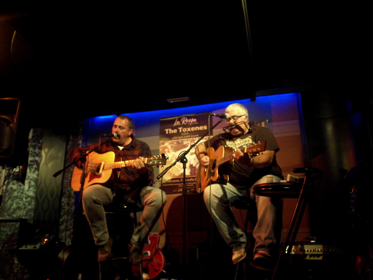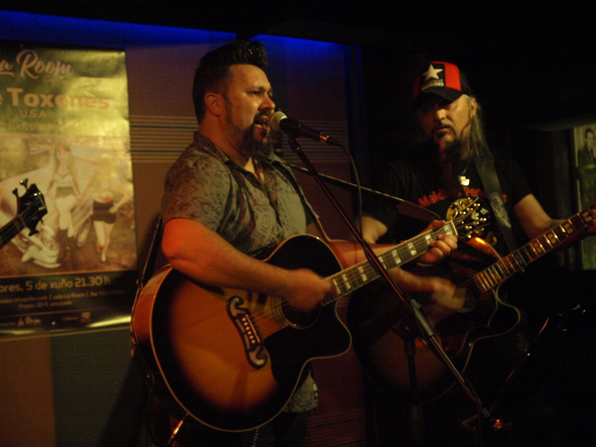 Nosotros vamos a las actuaciones musicales, que es lo nuestro. Primero actuaron los Crazy Ponys, grupo de tributo a Neil Young, en formato de dúo acústico (El grupo tiene una formación más amplia en enchufado). Luego entraron en liza Cuero & Laca, o como a ellos les gusta definirse: dos pendejos y un rocketa, ya que su formación es Tony Torres (guitarra acústica), Octavio García (bajo), ambos de Malditos Pendejos y Fredy Rocker (guitarra acústica y voz), con un repertorio de temas fundamentalmente compuestos o versionados en los 50, con algunas aportaciones de los 60 (“Ranaway” de Del Shannon), 70 (“Burning Love”) y de los mismo 80 (“Marie Marie” de The Blasters). Temas clásicos-clásicos, algunos que hicieron el viaje desde otros estilos como el bluegrass, el rythm&blues o el jazz al rock & roll (“Blue moon of Kentucky”, “Hound Dog”, “That’s all right mamma”, “The Train kept a rollin”) que de voces como las de Bill Monroe, la grandiosa “Big Mama” Thorton o Tiny Bradshaw pasaron a las del Rey Elvis o Johnny Burnette. Otros compuestos ya en época y entorno rockabilly y rock & roll como “C’mon Everybody”, “Lucille”, “Baby let’s play house”, “Be Bop a Lula”, “Blue suede shoes”, “Oh boy”, “Summertime blues”, “Jailhouse rock”, “Tutti frutti”, “Great balls of fire”, legadas o versionadas por Eddie Cochran, Little Richard, Elvis, Gene Vincent, Carl Perkins, Buddy Holly o Jerry Lee Lewis. Hasta alguna de fuerte impronta country que se ha hecho su hueco en en el mundo del rock como “Folsom prison blues” del inolvidable Johnny Cash. Con invitaciones y subida al escenario de Carlos Mos o Susana Adalid.