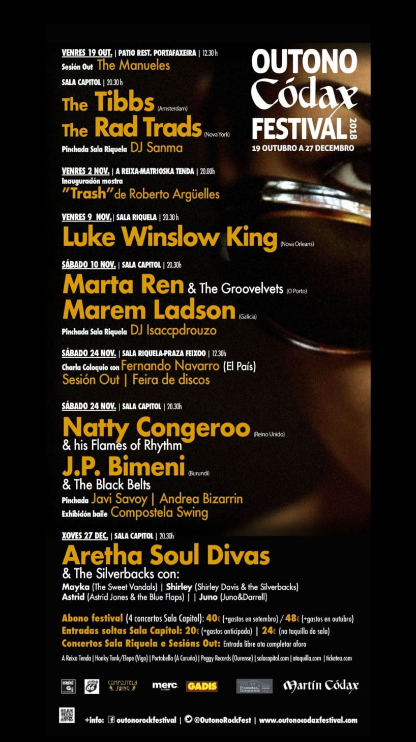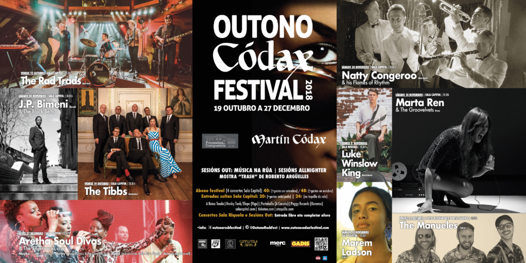 El Outono Códax Festival regresa, en la que será ya su octava edición, el próximo 19 de octubre a los escenarios de la capital de Galicia. El festival gallego de música negra por excelencia, se encargará un año más, de reunir en Compostela a lo mejor del género a través de su formato habitual: un ciclo de cinco grandes conciertos en el que se darán cita los sonidos más selectos del Soul, el Rythm&Blues, el Swing, el Funk y, por supuesto, el Rock&Roll.