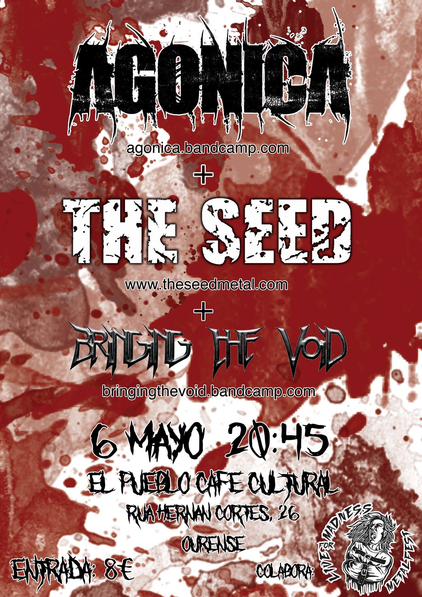 El próximo sábado 06 de mayo tendrá lugar en la ciudad de As Burgas una velada de música extrema en El Pueblo Café Cultural, a partir de las 20:45 h., y que contará con las actuaciones de Agónica, The Seed y Bringing the Void