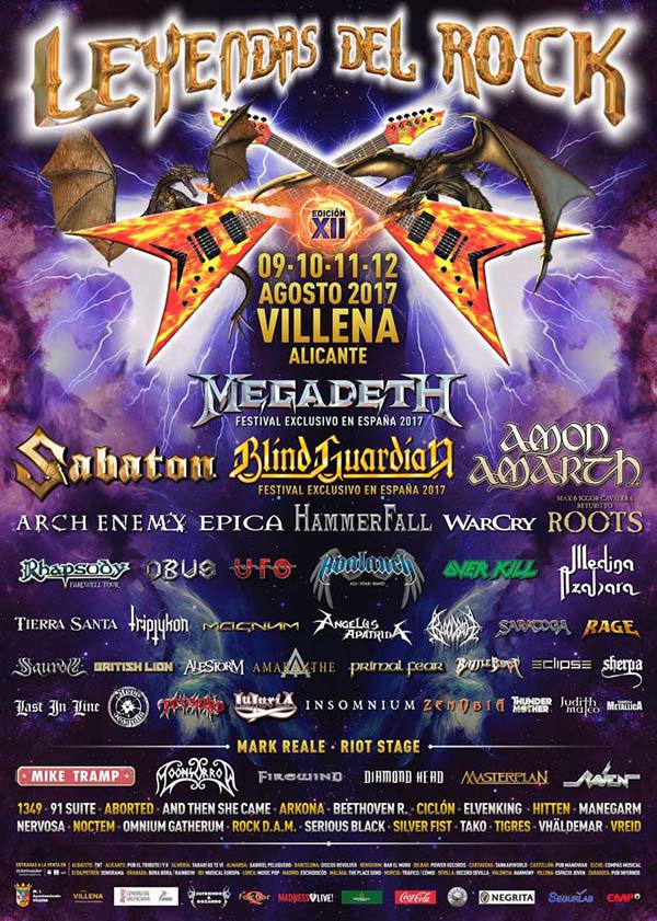 La decimosegunda edición del festival Leyendas del Rock se celebrará los días 9, 10, 11 y 12 de agosto de 2017 en Villena (Alicante). Un espacio privilegiado donde se puede disfrutar de césped natural, piscina, arbolado, ludoteca y otra serie de servicios que lo convierten en uno de los mejores recintos de España.
